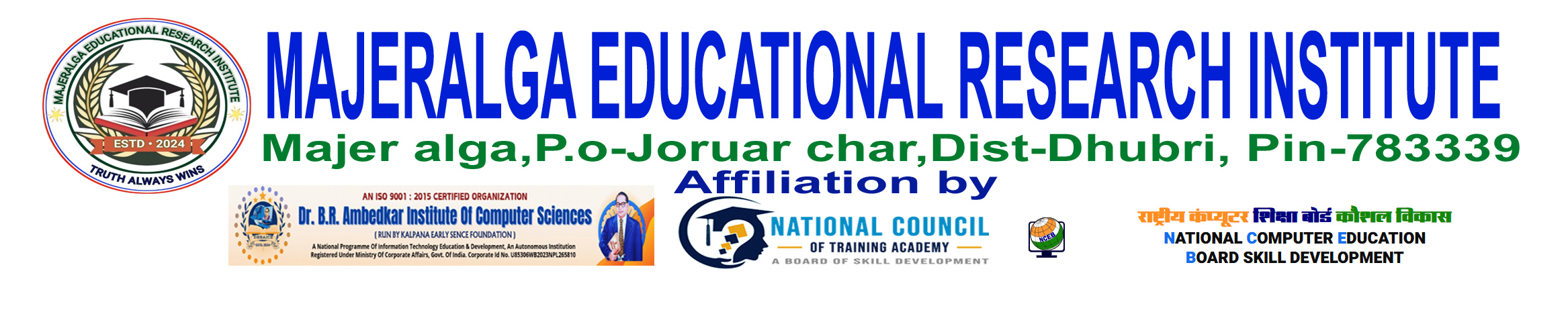 MAJERALGA EDUCATIONAL RESEARCH INSTITUTE is an autonomous body run by “MAJERALGA EDUCATIONAL RESEARCH INSTITUTE” Registered under S.R. Act XXI of 1860, Govt. of Assam(India), Regd No. Upcoming & MERI is Registered Under Ministry of Micro, Small & Madium Enterprises(MSME) Govt. of India its Registration Number. Upoming . It is an ISO 9001:2015 certified organisation its certificate number upcoming. MERI provides sophisticated Computer Education and Vocational Tranning. Our vision is to educate people and spread awareness about modern technologies and co-curricular courses which will lead to more employment and help to eradicate unemployment. MERI provides fully digita and online interface between MERI and Centre Heads and Students.